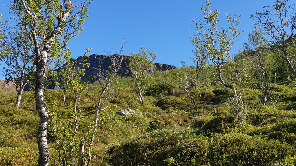 The mountains up here are sharp. I’m still learning about the geology, and everything I learn is fascinating. Many of the mountains are named with the suffix -tinden or -tindan meaning “tall, sharp mountaintop” in Norwegian. The tops are indeed sharp. Typical lower slopes are tumble-down rocks where moss, grass, shrub, and tree find homes. It’s my playground, and the playground changes with each season.