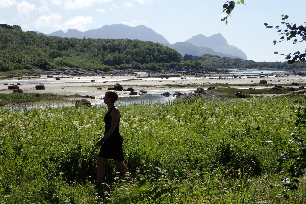 Back on the beach after my run, I got to play photographer. Marie helped me frame some shots for updating her profile photos on Outspoken Images. Here we are at Låter beach. Had I forced myself to climb Eidetinden, I would have missed the opportunity to take this photo.