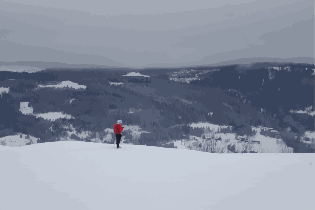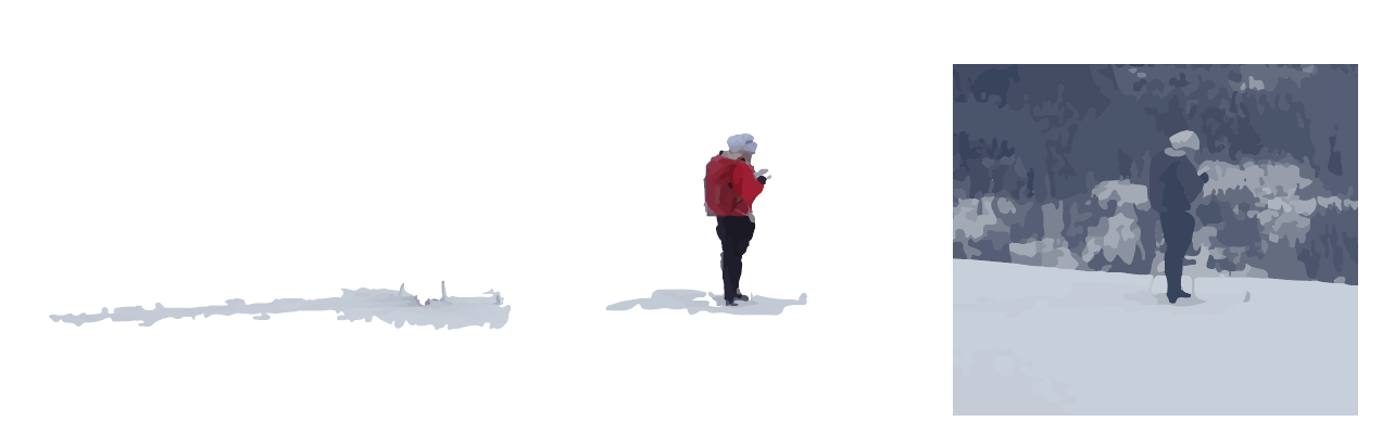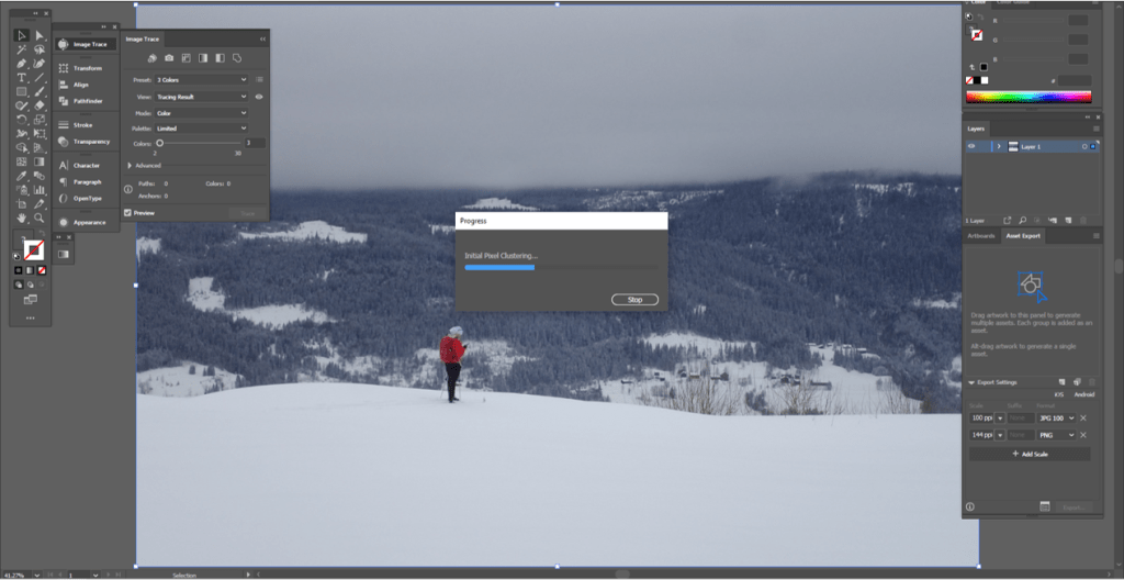 I wasn’t yet satisfied with the result. So, I made one more layer, this time highlighting my skis and my shadow in the snow. The colors there are so soft that the image trace wasn’t picking them up in the way I wanted. With one more iteration, I now have three layers. I line them up by eye, each in it’s own Layer in Illustrator for fast comparisons. Then it’s just left to drop all the pieces into the Export panel using Alt+drag. Click ‘Export’, follow the menu, and we’re done. Exporting is an experiment in its own right. These days, I’ve been using JPG 100.