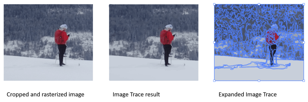 Expanding the result allows us to edit the pieces that make up the image, but prevents further adjustments with Image Trace. I will layer this result on top of the background image. So what I want to do is take away the trees and most of the snow from this result. The expanded result is a group, so I enter the group and start hacking away. Depending on the complexity of the image and the look I want, it can take rather a lot of creativity to wipe away the right pieces. I use the Selection Tool (V) to grab whole objects, the Direct Selection Tool (A) to grab paths or anchors, the Magic Wand (Y) to grab similar colors, and the Delete Anchor Point (-) as my main routes for getting rid of stuff.